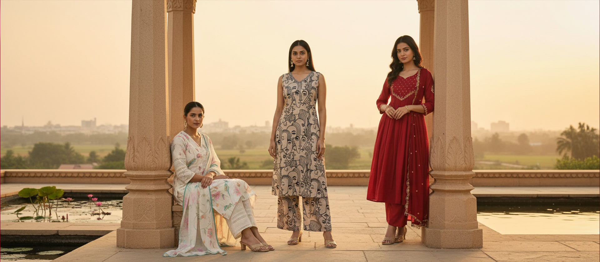 White roman silk kurti set with Brush paint digital printed pom-pom dupatta
