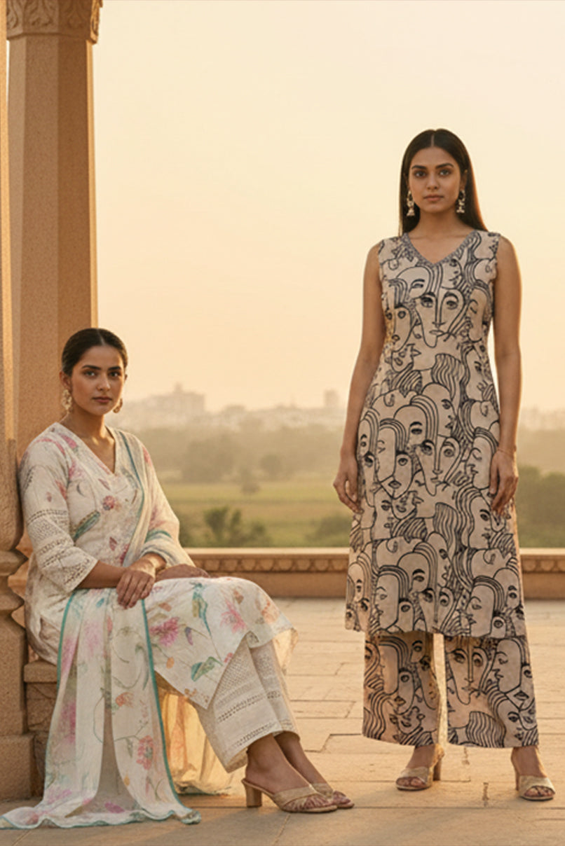 White cotton kurti set with chiffon work V-neck design and digital printed dupatta